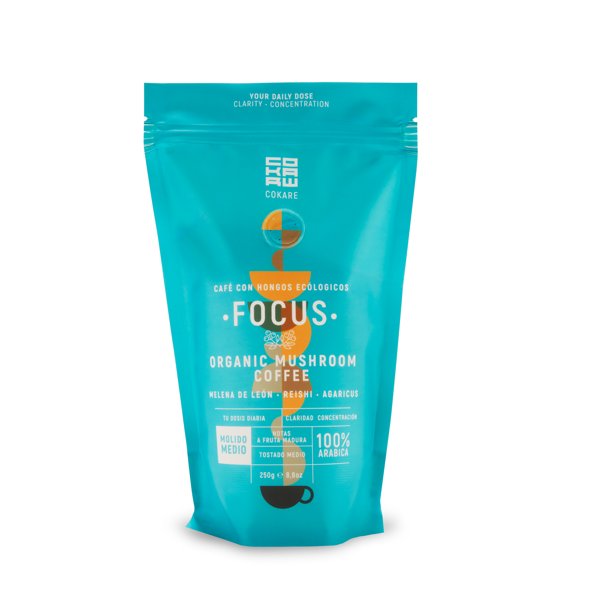 Café orgánico 100% Arábica con extractos de Lion's Mane, Reishi y Agaricus. Notas de fruta madura, tostado medio. 500mg de extracto por ración.